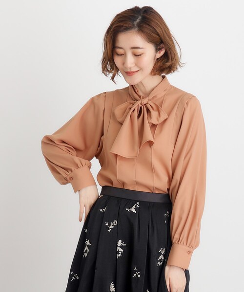 着こなし自在なボウタイブラウス 【デザイン】 様々な着こなしが楽しめるボウタイブラウス。 ボリュームのある一枚仕立てのリボンタイは、フロントリボンや、一絡げ、ネクタイ風にもアレンジができ、巻き方次第でさまざまなスタイリングをお楽しみいただけます。 また、衿元にはビジューの釦、胸元にはピンタックをあしらっており、タイなしで着用しても華やかに決まります。 肩周りが華奢に見えるウイングスリーブで、シルエットもトレンド感たっぷり。スタイリングに華を添えてくれます。 【素材】 程良い落ち感のジョーゼット素材。 柔らかな風合いですが、程よくコシのある素材でタイの扱いがしやすい素材です。 【スタイリング】 スタイリング次第で、フェミニンにもマニッシュにも着こなせるアイテムです。 ジャケットやジレのインナーに仕込んで、クラシカルなスタイルも素敵ですし、 メンズライクなトラウザーや、チノパン・デニム等のブラウスと対比するボトムで合わせるとトレンド感が高まります。 結び方次第でムードが変えられるのも魅力。 かっこよく決めたい日にはネクタイ結び、抜け感を出す一絡げ、 柔らかく見せる日にはリボン結びと、さまざまなスタイルを楽しんで頂けます。 ※照明の関係により、実際よりも色味が違って見える場合があります。また、パソコン・スマートフォンなどの環境により、若干製品と画像のカラーが異なる場合もございます。 【24AW】 モデル情報:身長166cm B80 W59 H86 着用サイズ:02(M) 店舗へのお問い合わせ商品番号:768-89016 ●製品寸法: 01(S):着丈61cm B101cm 袖丈59cm 首周り33cm 肩幅27cm アームホール27cm 02(M):着丈62cm B104cm 袖丈60cm 首周り34cm 肩幅28cm アームホール27cm 03(L):着丈63cm B107cm 袖丈61cm 首周り34cm 肩幅29cm アームホール28cm 04(LL):着丈64cm B110cm 袖丈62cm 首周り35cm 肩幅30cm アームホール28cm 05(3L):着丈65cm B113cm 袖丈63cm 首周り36cm 肩幅31cm アームホール29cm 備考: