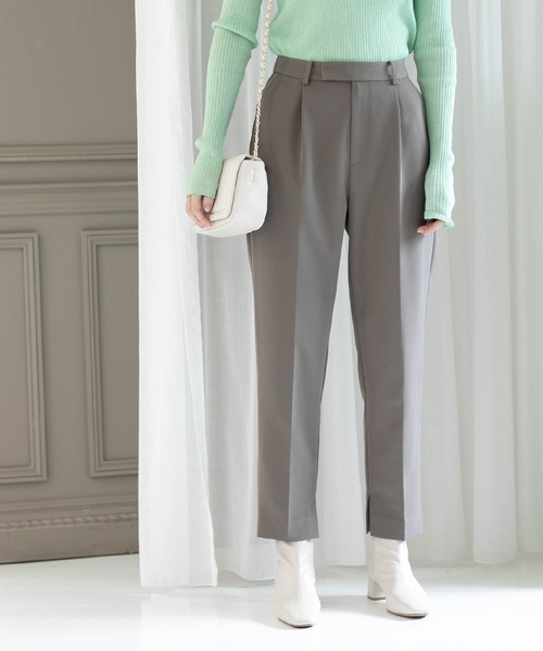 内側スリットがワンポイントのテーパードパンツ【デザイン】・すっきりしたタックテーパーシルエットに、裾の内側にスリットを入れたテーパードパンツ・ウエストの後ろ部分はゴム仕様なので、楽な着心地。・ベーシックなシルエットながらも、裾にポイントを付けたデザインパンツです。・同素材でお作りしている、ペプラムジレ(637-49010)とのセットアップでのスタイリングもおすすめです。※ポケット数:横×2 後ろ(ダミー)×2【素材】・程よくストレッチ性があり、膨らみ感とクリーンな表面感が特徴のダブルクロス(二重織)素材を使用・ストレッチ性があるので、穿き心地も快適・マシンウオッシャブルでご自宅でのお洗濯も可能※裏地なし※照明の関係により、実際よりも色味が違って見える場合があります。また、パソコン・スマートフォンなどの環境により、若干製品と画像のカラーが異なる場合もございます。モデル情報:身長166cm B72 W62 H86 着用サイズ:38(M)店舗へのお問い合わせ商品番号:637-69023●製品寸法:36(S):W66cm H96cm 股下64cm 裾幅15cm 総丈92cm38(M):W69cm H99cm 股下65cm 裾幅16cm 総丈94cm40(L):W72cm H102cm 股下67cm 裾幅17cm 総丈96cm42(LL):W75cm H105cm 股下67cm 裾幅18cm 総丈97cm備考: