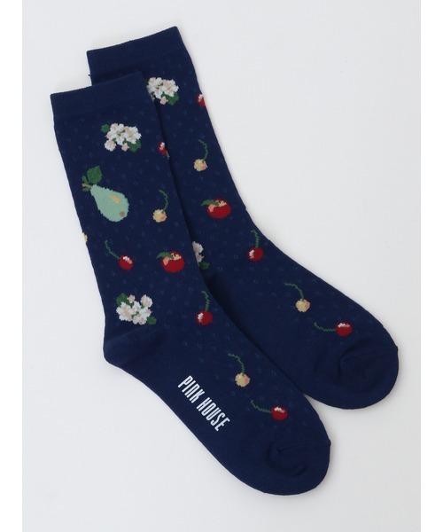 【fruits】 19世紀のヨーロッパ絵画に描かれた豊穣なフルーツたちにインスピレーションを受けて描かれたボタニカルなテキスタイル。 ラフランスにアプリコット、そしてチェリーといった芳醇なフルーツたち。描くタッチや色使いはあえて色調差を出すことによって、成熟して今にも香気が漂ってきそうな浪漫的なプリントに仕上げています。 芳醇なフルーツのマテリアルに、華やかなポルカドットチュールやフリル使いなど19世紀のファッションにインスパイアされたアイテムたち。優美で気品溢れるシリーズに仕上がりました。 ”フルーツプリント”に描かれた、ラフランスにアプリコット、そしてチェリーをランダムに散りばめたソックス。うっすらとあしらった小紋柄がそれぞれの柄をシックにひきたてます。 クロはフルーツの豊かな色彩が映える華やかなイメージ、ベージュピンクは4色のなかで最もかわいらしさのあるソフトなカラー、チェリーレッドはラフランスのグリーンが際立つ重厚感溢れる仕上がりに。そして、ネイビーはやや青みがかかった神秘的なカラーに。それぞれのカラーをお楽しみいただけます。お洋服を一緒にコーディネイトしてくださいね。シリーズに合わせなくても足元のポイント使いにぜひどうぞ。