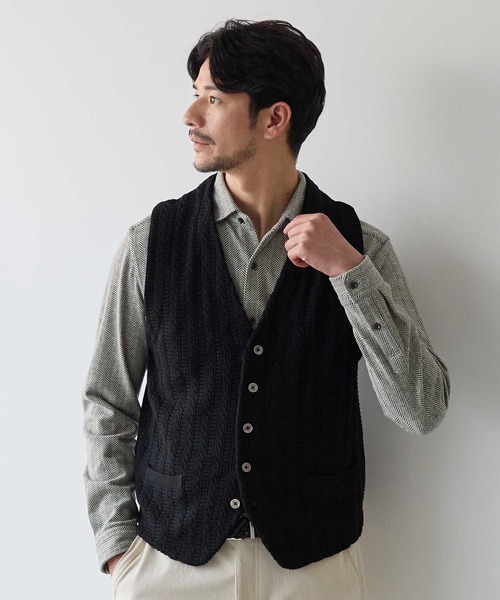 ハイゲージの『ウールブレンドニットジレ』【素材/デザイン】ハイゲージのウールブレンドニット素材を使用したニットジレ。前身頃はシェブロン(山谷、ジグザグ)柄のジャガードで編み立て、後身頃は天竺編みで前と後ろでコントラストを出しています。【スタイリング】暑い時期は、無地ライクなシャツやTシャツなどの上にサラッと羽織るコーディネートがおすすめです。秋が深まるとテーラードジャケットの下に差し込むなどコーディネートにプラスワンのアクセントを持たせてくれるアイテムです。【UNION STATION/ ユニオンステーション】「さりげない上品さ」をキーワードに大人に向けた、素材感と着心地にこだわったアイテムを展開。肩ひじを張らずに自分に合ったおしゃれを楽しめる、きれいめスタイルを提案します。私たちは服を通してみなさまの心が明るくなったりワクワクしたり、ささやかな高揚感を感じていただけるような”おしゃれ着”をお届けします。※屋外での撮影画像は光の加減で、実際の商品より明るく見える場合が御座います。商品の色味は生地アップ・スタジオ撮影の画像をご参考下さい。※画像の商品はサンプルとなりますので実際の商品と仕様、加工、サイズが若干異なる場合がございます。