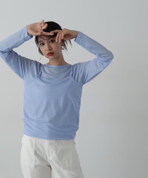 キャミソールと長袖トップスのレイヤーカットソーです。 体のラインを拾いすぎないシルエットはシンプルなデザインながらも、1枚で旬なレイヤードスタイルが完成します。 デニムカジュアル、ドラマチックなボリュームスカートを合わせるなど、様々なコーディネートを楽しめます。 ※こちらの商品はキャミとトップスが裾で繋がっており、折り返して着用します ********************** 透け感:ややあり 裏地:なし 伸縮性:ややあり 光沢感:なし 生地の厚さ:薄手 ********************** ●取り扱いについては、商品についている品質表示でご確認ください。 ●撮影はサンプル商品で行っている為、仕様とサイズが異なる場合がございます。 ●スタジオ及び屋外で撮影した着用画像は、光の当たり具合やご覧のモニターによって色味が違って見える場合があります。予めご了承ください。 ●生産時期により色・素材・サイズ感など多少異なる場合がございます。予めご了承ください。 ≪お買い物をよりお楽しみいただくために≫ ・「商品のお気に入り登録」 再入荷通知や、ラストの通知、セール通知も受け取ることができます。 ・「ブランドのお気に入り登録」 新商品や再入荷など、お得な情報を受け取ることができます。