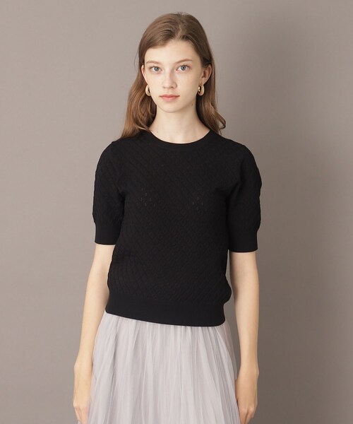 【初夏から暑さの残る初秋まで使える、レース編みが可愛いハーフスリーブプルオーバー】編地の可愛らしさと綺麗な色目が魅力のレース編みニット。薄手でフラットな素材感が多くなる初夏に、涼し気なレース編みと凹凸のある表情がスタイリングのアクセントになる事間違いなし!素材にはヴィスコースとポリエステルを撚糸した糸を使用することで、程よい光沢と立体感のある目面が生まれます。裏側にストレッチ糸をプレーティングし、柄の凹凸感とキックバックの良さが加わり着心地も良いプルオーバー。コンパクトな身頃とクルーネックのバランスがきれい目な印象を作り、どんなボトムにも合わせやすいプルオーバー。ナローなシルエットのサーキュラースカートやマーメイドスカートを合わせた女性らしいスタイリングから、デニムのワイドパンツとのカジュアルなコーディネートまで、手持ちのアイテムに可愛らしさを加えてくれるアイテムです。※照明の関係により、実際よりも色味が違って見える場合があります。また、パソコン・スマートフォンなどの環境により、若干製品と画像のカラーが異なる場合もございます。モデル情報:身長172cm B77 W58 H87 着用サイズ:38(M)店舗へのお問い合わせ商品番号:085-19040●製品寸法:34(SS):着丈46cm B76cm 袖丈25cm 肩幅33cm36(S):着丈48cm B80cm 袖丈26cm 肩幅34cm38(M):着丈49cm B84cm 袖丈26cm 肩幅35cm備考: