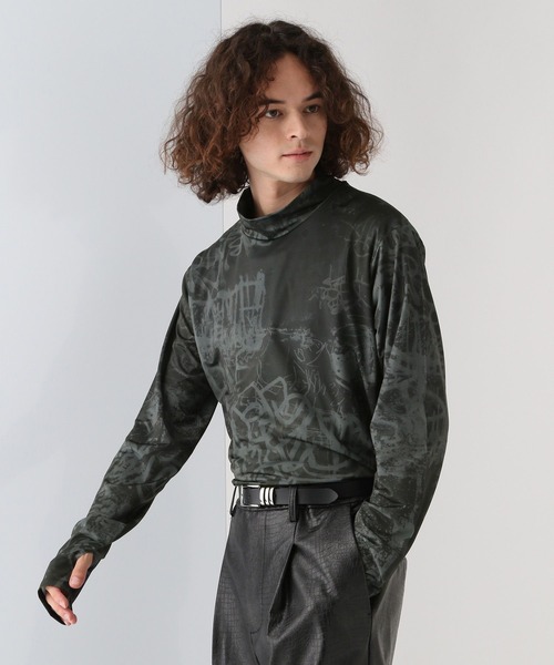 ーーー 薄手のカットソー生地にグラフィックをプリントカットソーが登場 ーーー point □伸縮性のある薄手のカットソー生地にオリジナルで作成したグラフィックをプリント。 □タイトなシルエットのモックネック仕様。 □袖にはフィンガーホールを採用。 □ブラックはウォールアート調のストリートなグラフィックをプリント。 □ブルーは惑星をモチーフにしたグラフィックをプリント。 □タイトシルエットで作り込むことで、秋冬にはアウターのインナーとしてレイヤードできます。