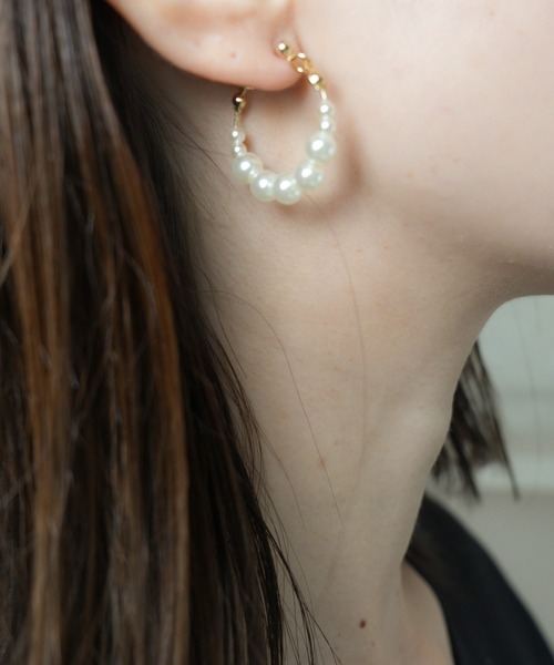 柔らかな光を放つパールフープピアス。程よくボリュームがあり、顔周りに華やかな存在感を演出してくれます。デイリーのカジュアルスタイルから、デートなどのキレイめコーデにと、幅広く活躍してくれるアイテムです。