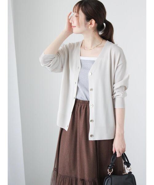きれいめなVネックのデザインで仕立てられたカーディガン。 接触冷感加工を施しているので、さらりとした肌触りを演出します。 袖口や裾のリブ切り替えが程よいフィット感をプラス。 冷房の効いた部屋や肌寒い季節のお出かけにも大活躍してくれるアイテムです。 ※商品画像は、撮影環境やお客様のご利用のPC・スマートフォンのモニター環境などにより実物と色味に差異がある場合がございます。