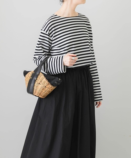 フレンチカジュアルな雰囲気のボーダーTシャツ ワードローブに加えたいトレンドに左右されない定番アイテム。1枚でも着やすいように、からだの線を拾いにくいサイズ感に仕上げています。シックなBLACK・優しい配色が着やすいMOCHAの2色をご用意しました。やや長めの袖がポイントでラフにまくって抜け感を出すのもおすすめ。パンツやスカートに合わせたり、ジャケットやカーディガンのインナーにも重宝します。お尻にかかる丈感なので、ボトムスに前だけインしても横からすっきり見え、コーディネートに活躍する一品。 【FABRIC】 ・柔らかく肌触りの良い天竺素材 ・1年中快適な着心地のコットン100% 【POINT】 ・首周りが開きすぎず安心感のあるデザイン ・程よくゆったりしたシルエットが大人の装いにマッチ 【2024 Autumn/Winter】【24AW】 ※商品画像は、光の当たり具合やパソコンなどの閲覧環境により、実際の色味と異なって見える場合がございます。予めご了承ください。 ※商品の色味の目安は、商品単体の画像をご参照ください。 ----------------------------- 《スタッフレビュー》 [スタッフA] 身長 : 158cm 普段の着用サイズ : S 【着用カラー/サイズ】 【サイズ感】袖も着丈も長めでゆるっと落ち感のあるシルエットです。身幅は大き過ぎないので、ジャンパースカートやサロペットのインナーにも最適です。 【素材感】コットン100%の薄地で柔らかな素材です。 【着心地】ゆったりですがごわつかず、着心地も良いです。 【その他】程よい首のつまりと絶妙なボーダーの幅でカジュアル過ぎずに着られるところが嬉しいです。 [スタッフB] 身長 : 164cm 普段の着用サイズ : M 【着用カラー/サイズ】 【サイズ感】お尻がすっぽり隠れる丈感です。ややゆったりとしたシルエットでラフな印象です。 【素材感】柔らかいコットン素材です。 【着心地】程よくゆったりしていて、着心地も抜群です◎ 【その他】首元が開きすぎない程良いデザインで、インナーが見えたりもせず着やすいです◎寒い時期もレイヤードで重宝するアイテムです! ----------------------------- ▼お気に入り登録のおすすめ▼ お気に入り登録商品は、マイページにて現在の価格情報や在庫状況の確認が可能です。 お買い物リストの管理に是非ご利用下さい。 素材感 透け感 : ややあり 伸縮性 : あり 裏地 : なし 光沢 : なし ポケット : なし