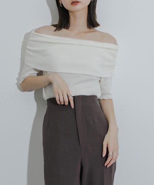 今年らしい肌見せでコーデをブラッシュアップ 〇トレンドのオフショルダーデザイン 〇シアー感のあるカットソー素材が女性らしい印象に 〇シャーリングの効いたデザインがポイント styling 今年らしい肌見せが叶うトップスは、デニムやカーゴパンツなど、ずるっとカジュアルなボトム合わせが今年らしいバランスです。 【2024 Spring/Summer】【24SS】 ※この商品は、素材の特性上、洗濯の際に多少の歪みが生じる恐れがあります。 ※直射日光や蛍光灯に長時間あたると変色したり、色褪せすることがありますのでご注意ください。 ※商品画像は、光の当たり具合やパソコンなどの閲覧環境により、実際の色味と異なって見える場合がございます。予めご了承ください。 ※商品の色味の目安は、商品単体の画像をご参照ください。 ▼お気に入り登録のおすすめ▼ お気に入り登録商品は、マイページにて現在の価格情報や在庫状況の確認が可能です。 お買い物リストの管理に是非ご利用下さい。 素材感 透け感 : ややあり(OFF WHITEのみ) 伸縮性 : あり 裏地 : なし 光沢 : なし ポケット : なし one