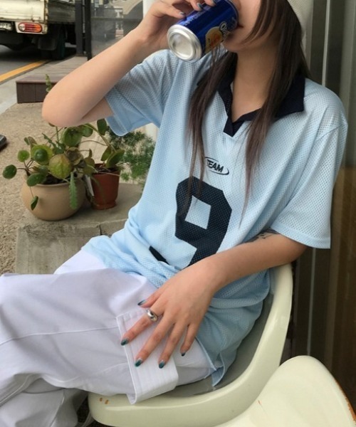トレンド性の高いスポーツMIXスタイルに抜群のアイテム。 ●POINT ユニフォームTシャツにシアーなポロデザインを落とし込みレディライクに仕上げたトップスです。 夏らしく清涼感のあるライトブルー、ホワイトの2色展開で、目を惹くナンバーデザインが特徴。 配色をアクセントに、スポーティーになりすぎないデザインがポイントです。 ●FABRIC 清涼感のあるサラッとしたメッシュ素材が、暑い夏にピッタリ! 全体のサイズ感にこだわり、体型カバーはもちろん一枚でワンピーズ風にご着用も可能です。 メンズも着用頂けるユニセックスアイテムです。 ●COORDINATE ミニ丈のスカートやトレンドのレースパンツと合わせてバレエコアなガーリーコーデはもちろん、太めのパンツと合わせたストリートコーデも◎ 様々なコーディネートに幅広く活躍する、この夏大注目のアイテムです。 スポーツミックスのブロークコア、ブロケットスタイルにもおすすめのアイテム。 スポーティアイテムにレース、リボンアイテムやビスチェキャミソールなどを合わせた ブローク×バレエコアな着こなしもおすすめです。 韓国アイドルを意識したY3Kにピッタリなアイテム。 ---------------------------------- 透け感: あり 厚さ: 薄い 伸縮性: あり 裏地: なし ポケット: なし ---------------------------------- 【ENIM BY VICKY/エニム バイ ビッキー】 ファッションにはルールがない、自分の好きなスタイルを自由に。 ”私を私らしくする、私ウケのファッション”をテーマにユニークなデザインと実用性を兼ねたワードローブを提案 ---------------------------------- 洗濯方法 家庭洗濯:液温は30℃を限度とし、洗濯機で非常に弱い洗濯ができる。 自然乾燥:日蔭の吊り干しがよい。 アイロン:底面温度150℃を限度としてアイロン仕上げができる。 ドライクリーニング:石油系溶剤による弱いドライクリーニングができる。 ---------------------------------- ※画像の商品はサンプルとなりますので実際の商品と仕様、加工、サイズが若干異なる場合がございます。 ※お客様のモニター環境により実際のお色と多少異なる場合がございます。 ※撮影状況や光の当たり具合により、色合いが異なって見える場合がございます。 ---------------------------------------------------------------------- ★《お気に入り登録》でお得な情報がいっぱい★ ・「商品のお気に入り登録」で再入荷通知や、ラストの通知、セール通知も受け取ることができます。 ・「ブランドのお気に入り登録」で新商品や再入荷など、お得な情報を受け取ることができます! ----------------------------------------------------------------------