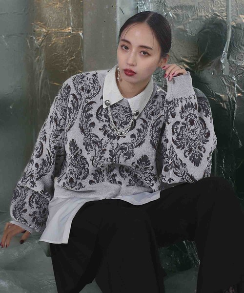 ーーー ダマスク柄が目を惹く肌触りのいいモール素材のニットプルオーバー ーーー point □ダマスク柄がポイントの総柄ニット □肌触りのいいモール素材を使用し、チクチク感がなくストレスフリーな着心地 □ショート丈ですっきりと見えるのがポイントでバランスがとりやすい □ゆったりめのシルエットで楽に着用でき、レイヤードも可能 styling 中にチュニック丈シャツを合わせたレイヤードスタイルもおすすめです◎ ショート丈なので、ワイドシルエットのボトムス合わせでも重たくならないです。 ※撮影環境により、光の当たり具合で 色味が違って見える場合があります。 あらかじめご了承下さい。