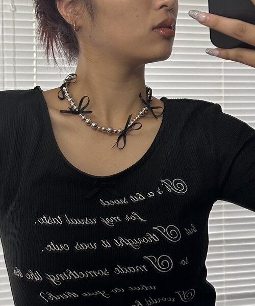 ■design ・沢山のリボンが施されている、ボールチェーンのネックレス。 ・いつものコーディネートに足すだけで、可愛らしい印象に。 ・使いやすい、シルバーとブラックの2色展開です。 ■サイズ 全長:36cm アジャスター:5cm ■その他 ※撮影環境やご覧のモニター環境によって、実物と多少色味が 異なって見える場合がございます。 ※サイト上のカラー名と、お届け商品に記載されているカラー名が異なる場合がございます。 《商品のお気に入り登録》《ブランド登録》がオススメ! ■商品のお気に入り登録 ハートマークをクリックしてお気に入りに登録。 完売カラーの再入荷通知や、ラスト1点の通知、セールやクーポン通知も受け取ることができます。 ■ブランドのお気に入り登録 新商品や再入荷等、いち早くブランドのお得な情報を受け取ることができます。