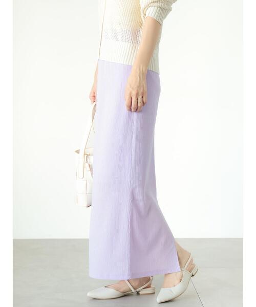 独特なシボのある生地が清涼感を漂わせるナロースカート。タイトなIラインシルエットで、すらりとした脚長効果が得られるのも魅力的なポイント◎ウエスト部分はゴム仕様になっており安心感のある穿き心地です。カジュアルな普段使いから、キレイめなお出かけスタイルにと、幅広く活躍してくれます。※商品画像は、撮影環境やお客様のご利用のPC・スマートフォンのモニター環境などにより実物と色味に差異がある場合がございます。【その他採寸】F ウエスト:[後ゴム仕様]68cm