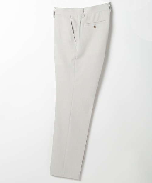 メランジ調の糸を使用したウール調ストレッチ素材のパンツ。軽量感あるソフトでしなやかな風合いが特徴です。ポリエステル素材なのでシワになりにくく、吸水速乾性に優れたイージーケアアイテムです。足長に見えるスリムイージーテーパードシルエットでジャケットはもちろん、ニット等の秋冬シーズンアイテムとの相性も良いコーディネイトの汎用性が高いアイテムです。【サイズ表記に関して】商品タグにはサイズ部分に数字が表記されています。01はSサイズ、02はMサイズ、03はLサイズ、04はLLサイズを表します。モデル:身長:184cm バスト:94cm ウェスト:73cm ヒップ:95cm 着用サイズ:03(L)※着用画像は光の加減等で仕様が異なる場合があります。※着用画像はサンプルのため仕様が異なる場合があります。