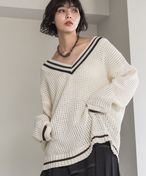 ♦モールメッシュVラインプルオーバー♦ モール糸の素材感にプレッピーな配色Vラインを組み合わせたニットプルオーバー。 プレッピー×モードな雰囲気が、シンプルボトムともデザインボトムともマッチします。 緩めのネックラインなので、ロンT、ハイネック、シャツと、インナーとのレイヤードが楽しめます。 暖かみのある雰囲気ながらメッシュ編みなので、暑さが残る秋口からでも取り入れていただきやすいアイテムです。 〈注意事項〉 ・サンプルにて撮影をしておりますので、実際の商品とは素材や仕様・加工・サイズ等が若干異なる場合がございます。 ・モニター・環境等により実際の商品と色味が多少異なって表示される場合がございます。予めご了承をお願いいたします。 ・撮影環境により、光の当たり具合で色味が違って見える場合があります。あらかじめご了承下さい。 ▼気になるアイテムは《お気に入り登録》がおすすめです! 完売カラーの再入荷情報、セール情報、ラスト1点の通知を受け取ることができます! ▼《ブランドのお気に入り登録》で新商品や再入荷などのお得な情報をいち早くお知らせします。