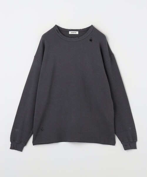 しっかりした肉感のサーマルを使用したロングスリーブTシャツ。衿、袖口と本体にダメージを控えめに施して着ごたえのあるアイテムに仕上げています。身幅にゆとりのあるリラックスシルエット。ユニセックスで着用頂けます。【注意事項】※商品を使用前に、タグ等に記載されている「取り扱い上の注意書き」、「洗濯表示」を必ずご確認ください。※商品画像は、光の当たり具合やパソコンなどの閲覧環境により、実際の色味と異なって見える場合がございます。あらかじめご了承ください。※商品の色味の目安は、商品単体の画像をご参照ください。※画像の商品はサンプルです。【アウトレット商品のご説明】・アウトレット商品につきましては包装やパッケージに破損・汚れが見られる場合にも、商品に欠陥が認められない際にはそのままの状態でお送りいたします。・返品、ご注文確定後の内容変更・追加注文はお受けできません。・セールアイテムは予告なく価格の変更を行う場合がございますが、ご購入後のアイテムについての価格変更はお受けいたしかねます。また、タグの表記と購入価格が異なる場合がございます。・"不良品"、"ご注文内容と異なる商品"が到着した場合は、お客様よりご連絡をいただいた時点で弊社に在庫がある場合に限り、交換対応いたします。なお、セールアイテムのため、お品切れの場合は返金でのご対応といたします。