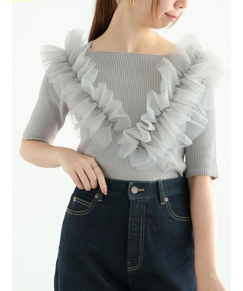 くしゅっとしたチュールフリルが華やかな印象を与えるニット。伸縮性のあるリブ素材を使用しているので、タイトなフィット感を演出します。デコルテを美しく魅せるネックラインもポイント。いつものコーデにプラスするだけで一気に今年らしいムードに。※商品画像は、撮影環境やお客様のご利用のPC・スマートフォンのモニター環境などにより実物と色味に差異がある場合がございます。
