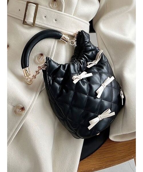 キルティングとリボンの王道可愛いデザイン▽デザイン▽トレンド要素を詰め込んだハンドバッグ。コロンとしていてコーデにプラスしやすい小ぶりのバッグですがしっかりマチがあるので荷物もしっかり収納できる優れもの♪内側にはチャック付きのポケットもありちょっとしたお出かけにも大活躍!持ち手部分もしっかりとしていて使いやすいバッグです。▽カラー▽黒・シルバーとリボンがバイカラーになったミックスの3色展開。