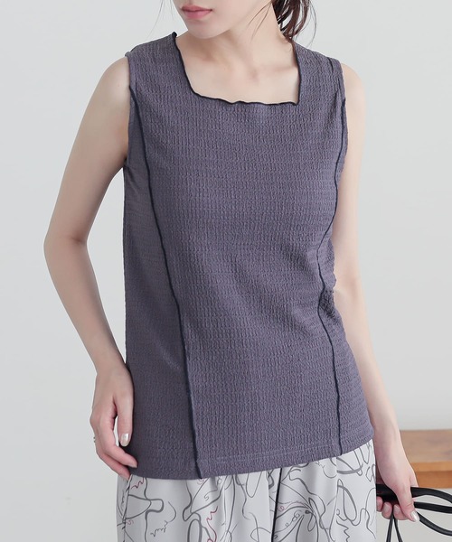 ■デザイン配色メローの切り替えラインがポイントになったタンクトップ。スクエアネックですっきり洗練された印象の一枚です。凹凸感のある生地を使用することで身体のラインを拾いにくいデザイン。■素材ポコポコとした凹凸感のある、さらりとした肌触りの生地。伸縮性があり、ストレスフリーな着心地です。※全体的に小さな穴が開いておりますが、生地の風合いの一部となっております。生地の特性となりますため、予めご了承の上ご購入いただきますようお願いいたします。※こちらの商品は透け感がございますので、インナーに注意してご着用ください。■コーディネートシアートップスや透かし編みニットなどのインナーに着用するのはもちろん、ジャケットやシャツを羽織って配色メローをちらりと見せるコーディネートもおすすめです。