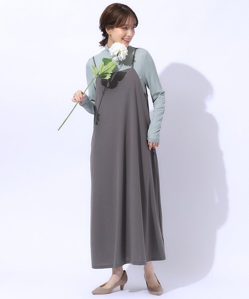 【デザイン】ゆったりしたシルエットで楽に着られる、シーズンレスで使えるキャミワンピース。胸元はまっすぐですっきり見えするデザインで、素材の落ち感を活かし裾がふわっと上品に揺れながらもすっきりしたフレアラインにこだわりました。裏面がサラサラ心地よく+脱ぎ着しやすく、インナー次第でオールシーズン活躍するアイテムです。※ポケット数:横×2【スタイリング】気温が高い時期はTシャツやブラウス、寒くなったらタートルネックのニットやカットソーなどインナー次第でいろんなシーンで使える便利なアイテムです。上からブルゾンやカーディガンなども羽織りやすく、寒い季節のコーデにも活躍。また、たたみシワも付きにくく、日常の気温とちがう場への旅行着のローテーションにもおすすめ。素材の表面感もきれいなので休日のお出かけにも最適です。【お客様からいただいたコメント】・ぽっちゃりの私でもスッキリ痩せて見えます。着るのが楽しみです。 (身長:153cm 体型:ふっくら ブラックのLサイズ購入)・フレアワンピースなのでシルエットが綺麗だし、低身長でも気にならなかったです。 (身長:153cm 体型:ふっくら ブラックのMサイズ購入)・ゆったりとしていて、丈もちょうど良いです。 夏は半袖で涼しくなったら長袖と合わせたいです。サンダルでもブーツでも合わせやすいです。 (身長:164cm 体型:普通 ブラックのMサイズ購入)・シックな色合いで色々合わせやすそう。 体型もカバーでき身長が小さいので長すぎると思いましたが大丈夫でした。お出かけが楽しみ。 (身長:150cm 体型:ふっくら チャコールグレーのMサイズ購入) とのお声を頂戴しております。【素材】上品なシボ感と、さらりとした肌触り、ドレープが魅力のジャージ素材。布帛見えできれい見えでもありつつ、ジャージならでは膨らみ・軽さで、カジュアルスタイルにも相性よい素材感です。ストレッチ性にも富み、裏面がサラサラなのも心地よいです。お仕事着からお出かけなどのデイリーシーンまで幅広く使っていただけます。※裏地なし※モデル情報:身長166cm B80 W59 H85 着用サイズ:02(M)店舗へのお問い合わせ商品番号:C62-59033●製品寸法:02(M):総丈119cm 着丈95cm B94cm W118cm H136cm03(L):総丈120cm 着丈96cm B97cm W122cm H140cm04(LL):総丈121cm 着丈97cm B100cm W126cm H144cm備考:重量:サンプルサイズ約345g