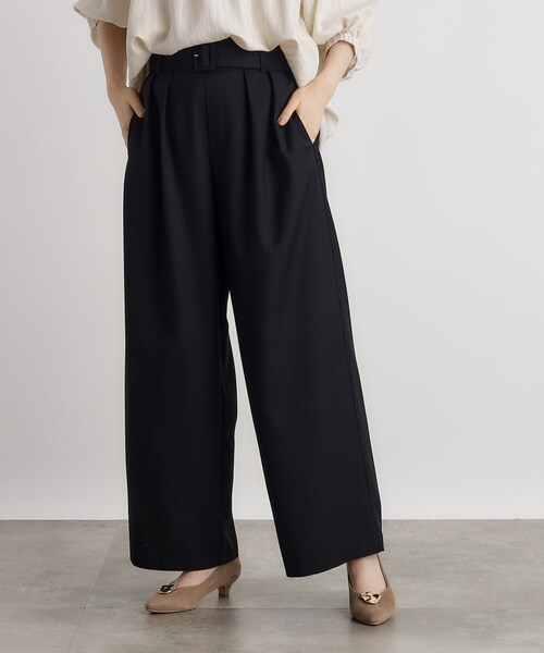 スタイリング自在なデザインワイドパンツ 【デザイン】 ツータックのボリュームパンツをあえてマスキュリンな素材で表現したデザインワイドパンツ。 ウエストはゴムギャザーの穿き込みタイプで、楽ちんな穿き心地ながら洒落感が嬉しいアイテムです。 共布のくるみバックルベルトをセットししており、ウエストのゴムが見えにくく、トップスインした時にも後ろ姿がきれいに決まります。 Tシャツやシンプルなトップスをさらりと合わせてもかっこよく決まるデザイン性が魅力の1枚です。 ※ポケット数:横×2 【素材】 メンズのスーツを思わせるようなクリアな表面のツイル素材を使用しています。 上品な艶感と落ち感が特徴で、タックギャザーのボリュームが綺麗に出る素材です。 ※裏地なし 【スタイリング】 トップス次第で様々なスタイリングが楽しめるアイテム。 ベーシックなリブニットやロゴTをさらりと合わせたラフなスタイルも素敵ですし、レースブラウスなどレディライクなアイテムを組み合わせたマスキュリンなスタイルもおすすめです。 足元もヒールパンプスで綺麗めに、カジュアルにスニーカー合わせと、その日のムードに合わせて幅広く合わせていただけます。 ※照明の関係により、実際よりも色味が違って見える場合があります。また、パソコン・スマートフォンなどの環境により、若干製品と画像のカラーが異なる場合もございます。 【24AW】 モデル情報:身長166cm B80 W59 H86 着用サイズ:02(M) 店舗へのお問い合わせ商品番号:768-69016 ●製品寸法: 01(S):総丈99cm W66cm H109cm 股下64cm 前股上34cm 渡り幅36cm 裾幅27cm 付属ベルト全長107cm 02(M):総丈100cm W69cm H112cm 股下65cm 前股上35cm 渡り幅37cm 裾幅28cm 付属ベルト全長110cm 03(L):総丈101cm W72cm H115cm 股下66cm 前股上35cm 渡り幅38cm 裾幅29cm 付属ベルト全長113cm 04(LL):総丈103cm W75cm H118cm 股下67cm 前股上35cm 渡り幅39cm 裾幅30cm 付属ベルト全長116cm 05(3L):総丈103cm W78cm H121cm 股下67cm 前股上36cm 渡り幅40cm 裾幅30cm 付属ベルト全長119cm 備考: