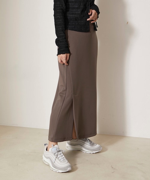【デザイン・シルエット】 柔らかく編み立てた、もっちり感のある生地にお肌に優しい保湿加工を施したオリジナルファブリックを使用。 縦のラインを強調するストレートなシルエットがスタイルアップして見えるスカート。ほどよいスリットが上品な色気を感じさせるスカートです。 さまざまなコーデに馴染みやすい無地カラーとニュアンス的なマーブリングが魅力の総柄プリントの2色展開です。 同素材でプルオーバー(品番:NJM14270)、パンツ(品番:NJS14240)も展開中。 【コーディネート】 ボリュームのあるデザイントップスやTシャツにショート丈のニット、ロングブーツとのスタイリングもおすすめです。 【素材】 skin wear:保湿加工を施したお肌に優しい素材 ariy jersey:ポリエステル糸を接結構造にして生地と生地の間に空間を作り、膨らみと軽さを実現。 UV、接触冷感、保湿加工、サスティナブル素材。 もっちり感が心地いいダンボール素材を使用しました。 ほど良いハリ感でキレイ見えしながらも、しっかりとしたストレッチ感が魅力の生地です。 ペットボトル由来の再生ポリエステルを使用したオリジナルファブリックです。 ーーーーーーーーーーーーーーーーーーーーーーー 透け感:なし 裏地:なし 光沢感:ややあり 伸縮性:あり 生地の厚さ:ふつう その他:ポケットあり ーーーーーーーーーーーーーーーーーーーーーーー 【モデル着用サイズ】 モデル1 H176 B78 W60 H87 モデル2 H164 B81 W61 H90 着用サイズ FREE ※実際の商品はお客様のお使いの端末や閲覧環境により、写真と実物の色味や質感が多少異なって見える場合がございます。予めご了承ください。 ※伸縮性に富んだ素材のため、多少のサイズ誤差が生じる場合もございます。 セットアップ対応/ダンボール素材/ロングスカート/ラップスカート