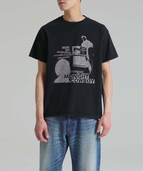 ウォッシュ加工を施したコットン天竺ボディを使用したショートスリーブTシャツ。フロントにオールドスクールなアメリカ映画にインスパイアされたグラフィック、フロント右下にコピーライトのレターグラフィックをラバープリントで表現したデザイン。身幅にゆとりのあるシルエット。3色4サイズ展開。