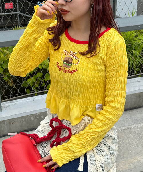 リンガーデザインがアクセントになるシャーリングカットソー ※バックプリントはイエローのみとなっております。 ▼ポイント 大胆に施されたシャーリングが印象的なカットソー。 トレンドのショート丈と程よいフィット感ですっきりとした印象に。 ハロサンらしい配色カラーがポイントです◎ ポップなフロントプリントはカラーによってアソートとなっております。 ▼スタイリング カラフルな配色使いがシンプルなデニム合わせでも決まる1枚。 コンパクトなシルエットなので、キャミワンピやビスチェをレイヤードしたスタイリングもおすすめです◎ ビーニーやキャップなどの小物を合わせるとスポーティーな印象になります。 --------------------------------------------------- 透け感:なし 伸縮性:あり 裏地:なし 光沢:なし --------------------------------------------------- 家庭洗濯:40℃限度/洗濯機[非常に弱い] タンブル乾燥:不可 アイロン:低温110℃まで※スチームなし クリーニング:石油系溶剤による弱いドライクリーニング可、非常に弱い処理によるウェットクリーニング可 ●洗濯の際は裏返してネットに入れて下さい。 ●浸け置き洗いは避け、洗濯後はすぐに脱水して、形を整えて陰干ししてください。 ●濃色製品は、色移りすることがありますので、他の物と分けて洗濯してください。 ●蛍光増白剤入り洗剤を使用しないでください。 ●アイロンの際はあて布を使用してください。 ●着用時の摩擦や洗濯により、表面に毛玉が発生しますので、発生した毛玉ははさみ等でカットしてください。 --------------------------------------------------- 【HELLO.SANFRANCISCO/ハローサンフランシスコ】 西海岸を代表するサンフランシスコ。年中暖かく、穏やかでフレンドリーな都市。少し懐かしさを感じる柄やアイテムを今の女の子に向けて提案。メンズライクな素材を女の子が着るシルエットに落とし込んだアイテムなどトレンドに敏感でいろんな気分に合わせて、服を選ぶ女の子のためのシリーズ。 ------------------------------------------------------ ※着用、お取り扱いの際は、商品についている品質表示とアテンションタグを必ずご確認下さい。 ※画像の商品はサンプルです。実際の商品と仕様、加工、サイズが若干異なる場合がございます。 ※可能な限り実物に近いカラーにて掲載していますが、撮影環境やモニター環境などにより製品と画像のカラーがやや異なって見える場合もございます。予めご了承ください。 【お買いものをよりお楽しみいただく為に!!】 ▼商品のお気に入り登録(ハートマークをクリック) お気に入りアイテムの完売カラーの再入荷通知や、ラスト1点の通知、セールの通知も受け取ることができます。 ▼ブランドのお気に入り登録 新商品や再入荷、クーポン配布などのお得な情報を受け取ることができます。