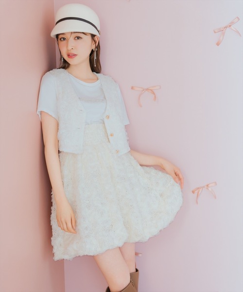 フラワーレースが立体感を演出してくれるレースバルーンスカート 【Design】 ・丸みを帯びたバルーンデザインが柔らかい印象を与えてくれるミニスカート。 ・ボトムスにボリューム感を加えることで、華奢見えさせてくれます。 ・ウエスト幅を広めにとっているので、ハイウエストでご着用いただけます。 ・同素材のレースベスト【品番:20082428900099】とセットアップ風にコーディネートするのがおすすめ♪ ・シンプルTシャツやニットなどのトップスと合わせていただくことで、フラワーレースの立体感を引き立ててくれます! ・素材で遊ぶ、大人のファッションスタイルをお楽しみいただけるアイテムです。 ・ウエストは総ゴム仕様。 【Fabic】 ・ドラマチックに演出してくれるフラワーレース生地を使用。 ・ホワイト、エクリュ、ブラックの3色展開となります。 【Care】 ドライクリーニング F:(00):着丈50㎝/ウエスト60㎝/裾周り68㎝