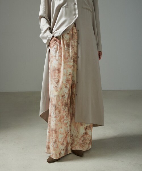 ■デザイン/シルエット シンプルなリラックスパンツのデザインを表面感のあるプリントのベロア生地で作ることで、上品さと抜け感を兼ね備えたアイテムに仕上げています。 落ち感とさり気ない光沢がある生地で、こなれた印象に。シンプルなトップス合わせでも着映えするアイテムです。 プリント柄は、今季のテーマである“ストラータ”から、珪化木(けいかぼく、植物の化石)をイメージしたデザイン。 ナチュラルなブラウン、天然石のようなピンクを感じる絶妙なニュアンスカラーです。 ■素材 上品な光沢と毛並みのベロア素材。ストレッチ性があり、 ふくらみとドレープ感、表面感が特徴です。そこにオリジナルのプリント柄を施しています。 ご自宅で手洗い可能なのも嬉しいポイント。 ■コーディネート 同シリーズのブラウスと合わせたセットアップもおすすめです。 ■セットアップで着用可能な同素材のブラウスもございます。 商品番号:SHH34480 商品名:ストーンウッドプリントベロアブラウス ■モデル身長:172cm 着用サイズ:M ----------------------------- 裏地:なし 光沢感:あり 透け感:なし ウエスト:ゴム ポケット:あり/ 伸縮性:あり 生地の厚さ:やや薄手 -----------------------------