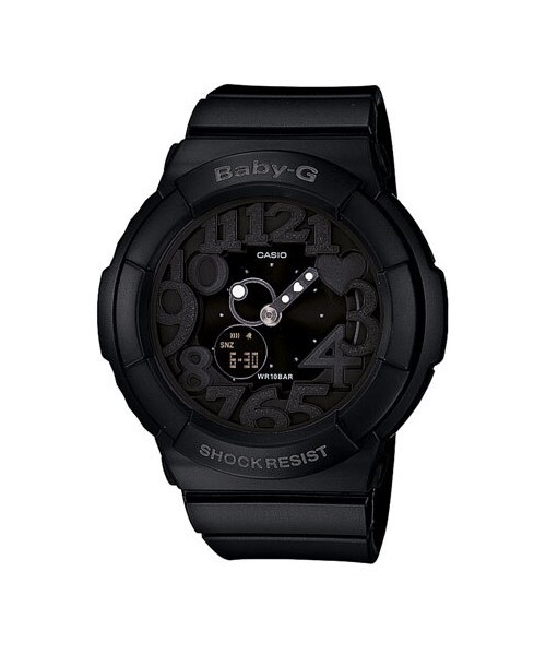 Glittery, oversized numbers and an ultraviolet LED light illuminate a shock-resistant watch encased in durable black resin. Digitally displayed features, including multiple alarms, stopwatch and auto calendar functions complete the round dial. Buckle closure. Approx. band length: 125mm adjustable to 180mm. Approx. band width: 18mm. Approx. case diameter: 43mm. Water-resistant to 10 ATM (100 meters). Resin/stainless steel/mineral crystal. By Baby-G; imported. Packaged in a white square watch box.