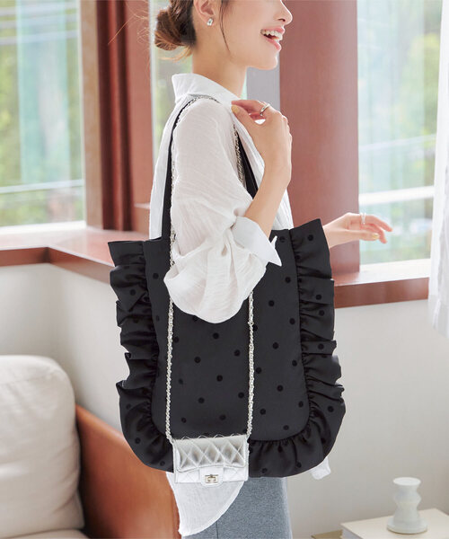 ■選べるタイプ・縦長タイプ(サイズ:A)・横長タイプ(サイズ:B)主役のバッグとしてもサブバッグとしても重宝するドット柄のフリルバッグ。持ち手が長めな縦型と持ち手が短めな横型の2種類をご用意しました。華やかなフリルデザインがカジュアルにもきれいめにもどんなスタイリングにも合わせやすいアイテムです。【素材・サイズ感】上品なフロッキードットを施した素材で使い勝手のよいサイズ感。内側についたポケットも嬉しいポイント。シックな配色で甘くなり過ぎず、様々なシーンで大活躍間違いなし。【STAFFコメント】A4サイズも入る便利なおしゃれ鞄。通勤通学用のPCバッグや、軽いので旅行のセカンドバッグにも使えてとっても便利です。私は子供のお稽古バッグにしていて使い勝手もいいので、ママ友に出産祝いでマザーズバッグとしてプレゼントしたら喜んでもらえたのでギフトにもおすすめです♡肩がけできて内ポケット付きなのも嬉しいポイント♪大きめサイズが使いやすくて、水玉模様が大人可愛いかばんです。※【伸縮】なし/【淡色透け】なし/【濃色透け】なし/【裏地】あり※当店はオリジナルのフロッキープリントを施しています。そのため、構造上永久的なものではなく、揉まれたり、こすられたりすると脱落しやすく、水洗いやクリーニングを繰り返すことにより柄が多少薄くなることがございます。摩擦などでもフロッキーが剥離・脱落することがございますので、やさしくお取り扱いいただけますようお願い申し上げます。《KOBE LETTUCE ー神戸レタスー》 プチプラレディースファッションからコスメまで、トレンドアイテムを豊富に取り揃えております。 毎シーズン発売されるインフルエンサーとのコラボ商品はSNSでも話題に。