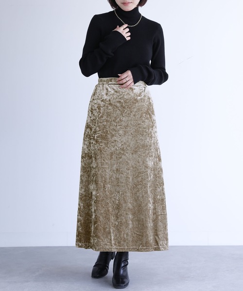 ■デザイン 上品さと光沢感が大人っぽい雰囲気のクラッシュベロアスカート。セミフレアシルエットで、身体のラインを拾いすぎずにご着用いただけます。ウエストはゴム入りで快適な穿き心地。 ■素材 伸縮性のあるクラッシュベロア生地を使用。裏地にもストレッチが効いた生地を使用し、すっきりとした見た目ながらストレスフリーな穿き心地を叶えます。 ■コーディネート ニットやロングTシャツなどのカジュアルアイテムとも相性抜群のスカート。程良く上品さも感じられる生地感のため、女性らしいアイテムと合わせたキレイめコーデにも◎