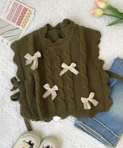 すっぽりと頭からかぶせるだけで着せられるサイドに結びひも付きのニットベスト。ネックと袖から裾にかけてぐるっと配置されたリブ編みのスカラップラインが可愛らしく、さらにリボンとケーブル編み模様が女の子らしさを引き立てます。お姫様気分のガーリーな1枚です。*生産時期により、色・サイズ・デザインが多少が異なる場合がございます。あらかじめ御了承下さい。