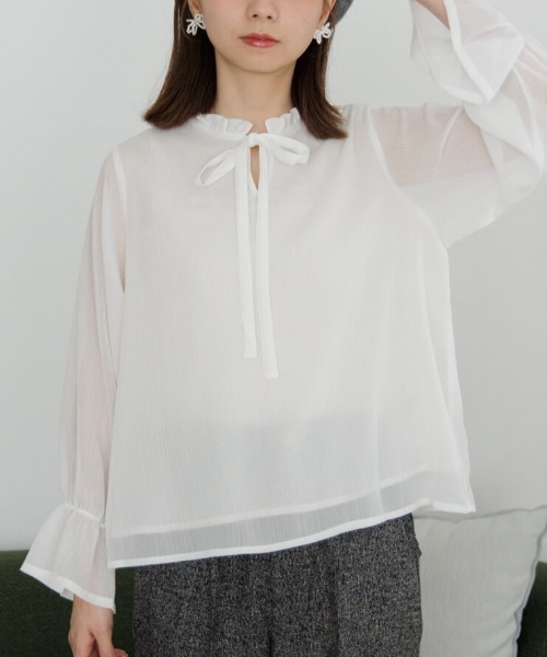 ■デザイン細かいラメが散りばめられたような キラキラ感がキュートなシフォンブラウス♡ 楊柳のような少しシボのある生地で、 ベーシックなアイテムながらシンプルすぎないところが魅力♪ 嬉しい前後2way仕様です◎ リボンの太さにもこだわり、 ほどよく甘い雰囲気に仕上げました。 デイリー使いやデートにぴったりな一枚です。 身頃部分は裏地付きで透けすぎない為、 オフィスシーンにもお使いいただけます。 smoky tapered pants2と合わせた、 シンプルながら上品で大人可愛いコーディネートがおすすめ! ballet tulle skirtなど秋の雰囲気を感じつつ涼しげなスタイリングも◎ カーディガンやスウェットなどとレイヤードして ネックと袖口のフリルをチラッと見せる着こなしもお楽しみください♪ ■flower/フラワー 「love&joy」をコンセプトに、商品に愛を込め、 お客様に楽しんでいただけるような、 ナチュラルでガーリーなアイテムを提案していきます。 【お買い物を上手にお楽しみいただくためのPOINT2つ】 ◎ 購入ボタン横の ♡ (ハートマーク)をクリック! 完売カラーの再入荷通知、残り1点の通知、 セールの通知を受け取れます。 (クリックまたはタップで商品のお気に入り登録♪) ◎ ショップのトップページにある ♡ (ハートマーク) 「お気に入りショップに追加」をクリック! 新商品や再入荷等、いち早くブランドの お得な情報を受け取れます。 (ブランドのお気に入り登録♪)