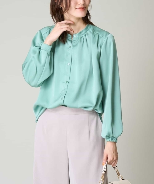 ◆秋の新作!通勤にもおすすめのきれいめブラウス◆ 【デザイン】 ・肩まわりにたっぷりギャザーを寄せた華やかなブラウス ・着丈は長め仕様で気になる腰回りもカバーします ・程よいパフスリーブデザインでほんのりフェミニンに ・しなやかな風合いで、上品な印象 ・オンオフ着られる万能なデザイン 【素材】 ・落ち感のある上品な生地感 ・洗濯後のシワが気にならないポリエステル素材 【コーディネート】 インもアウトも着まる丈感なのでスカートにインしたり デニムなどカジュアルなボトムとも好相性です。 きれいめボトムと合わせて通勤にもおすすめ◎ ボタンを開けて羽織りでの着こなしも。 -------------------- 透け感:なし 裏地:なし 伸縮性:なし 光沢感:ややあり 生地の厚さ:ふつう -------------------- ≪お気に入り登録機能の使い方≫ ■商品のお気に入り登録(ハートマークをクリック) 再入荷通知や値下げ等、お得なご案内を受けることができます。 -------------------- ※商品画像は、光の当たり具合やパソコンなどの閲覧環境により 実際の色味と異なって見える場合がございます。 商品の色味の目安は商品単体の画像をご参照ください。 ※34(XSサイズ)・42(XLサイズ)はWEB・一部限定店舗での販売です。