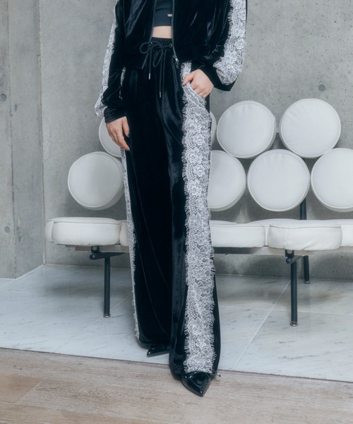 配色レースがポイントのラインパンツ。ウエストと裾には調節可能な紐付き。グレーはハリのあるジャージ素材、ブラックはベロア生地を使用しています。同素材を使用したレースライントラックジャケット(AG243JK0805)とセットアップでご着用いただけます。