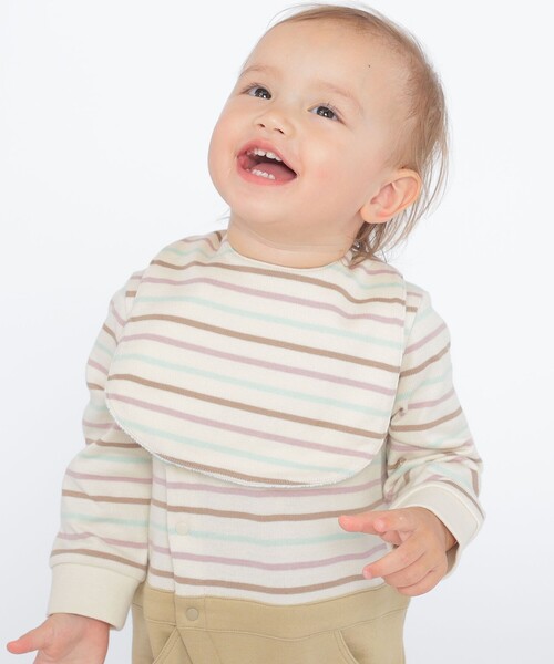 サステナブルなオーガニックコットン素材を使用したボーダースタイ。 裏側は優れた消臭・抗菌防臭機能のタツロンアルファを使用し、ソフトな風合いのパイル生地で仕上げました! 中央にあしらった「SHIPS」刺繍もさりげないアクセントに。 首まわりはスナップ釦で着脱もスムーズにでき、お洋服に合わせて両面使用できるのも嬉しいポイント♪ 信頼の日本製も魅力のひとつです。 同素材で、ロンパース(品番:512-84-0109)、男の子の長袖TEE(品番:512-04-0781、512-04-0782、512-04-0783)、女の子のフリルスリーブ長袖TEE(品番:512-04-0784、512-04-0785、512-04-0786)のご用意もございます。 兄弟姉妹のお揃いコーデやギフトにおすすめです! 【オーガニック100】 オーガニックコットンとは、3年間農薬や化学肥料を使っていない農地で、農薬や化学肥料を使わないで生産された綿花(有機栽培綿花)のことです。 本製品は、生産量が非常に少ないオーガニックコットンを使用して紡績されている、とても希少価値の高い糸です。 〈タツロンアルファ〉 タツロンアルファは様々な機能を合わせ持つ高機能コットン糸です。 ・消臭効果 ・抗菌・防臭 ・弱酸性持続 ・選択耐久性