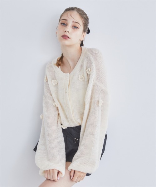 トレンドの立体的なクロシェ編みのお花がカワイイ モヘア風の素材を使ったカーディガン。 羽織としてもトップスとしても使えるので、コーディネートの幅が広がるアイテムです。 甘編みの独特なシアー感とゆるっとしたシルエットが女性らしさを際立たせます。 【styling】 ゆるっとしたシルエットなので、ミニ丈のボトムとの相性が◎ 中に着るインナー次第で、ロングシーズン着用可能です。 -------------------------- 透け感:あり 裏地:なし 伸縮性:あり 生地の厚さ:ふつう --------------------------- F:着丈43.5cm 身幅53cm 肩幅56cm 袖丈41cm