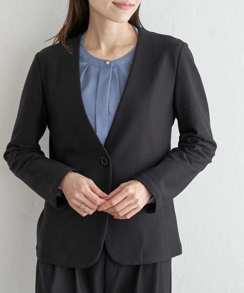 きちんと感&快適性を両立したノーカラージャケット。 洗濯機洗いも可能なため、毎日の通勤着としておすすめです。 【素材】 つるりとしたきれいな表面感のポンチ。 カットソーならではのストレッチ性が特徴です。 【デザイン】 ベーシックなVネックジャケット。 裏なしのカジュアル仕立てです。 【ikkaポイント】 ・カットソーならではのストレッチ性で着心地が楽 ・しっかりした中肉素材できちんとした印象 ・本格的な玉縁ポケットや袖口スリットなどのディテール ・同素材、別売りのパンツとセットアップで着用可能 【おすすめコーディネート】 セットアップ対応アイテムはコチラ! ・GOKU楽カットソーテーパードパンツ 品番 51520014 マシンウォッシャブル [洗濯方法] 洗濯の際はネットを使用してください