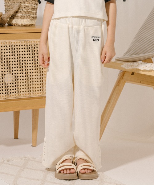 裾のリングボタンが旬な印象のロゴ刺繍入りワイドパンツ。 立体的な編地が可愛く肌触りの良い上質なワッフル素材は ワッフル素材は肌あたり柔らか、伸縮性もあり着心地快適◎ シンプルなシルエットで様々なスタイリングに合わせやすいのも嬉しいポイント。 足元に合わせて、サイドボタンを調整することで夏らしいスタイリングを楽しめます。 これからのイベント時期から初秋時期まで長く使えるように、ベーシックカラーを中心に展開。 リゾートシーンや、長時間移動などの旅行のシーン、デイリーにも着たいアイテムです。 ※アイボリーのみ若干の透け感がございます。同色系もしくはグレーカラーのインナーウェアの着用を推奨します。 ━━━━━━━━━━━━━━━ <アンニュイガールシリーズ> リラクシングで抜け感のあるスタイルに モードなエッセンスを加えた”エフォートレス”アイテム登場。 吸水性が高くシワになりにくいワッフル生地を使い、 無理をせず自然体な着こなしができるシルエットやデザインとなってます。 ━━━━━━━━━━━━━━━ ■商品仕様 裏地:なし/生地の厚さ:普通/透け感:アイボリーのみややあり/伸縮性:あり/ウエストゴム:あり ★『お気に入り登録』でお得な情報をいち早くGET★ ・「商品のお気に入り登録」で再入荷通知や、ラスト1点の通知、セール通知も受け取ることができます。 ・「ブランドのお気に入り登録」で新商品や再入荷など、お得な情報を受け取ることができます! ※他のキャンペーンにより、期間中に価格が変動する場合があります。 ※セールは予告なく終了させていただく場合もあります。 ※他のキャンペーンにより、期間中に価格が変動する場合があります。※セールは予告なく終了させていただく場合もあります。