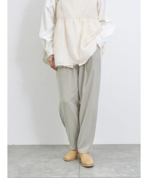 とろみのあるパウダーツイルで仕立てられたイージーパンツ。 裾に向かって細くなっていくテーパードシルエットが、レッグラインもすっきりとした印象にみせてくれます。 ウエストはゴム+ドロスト仕様になっており、安心感のある穿き心地も◎ カジュアルにもキレイめにもスタイリングのアレンジが楽しめる1着です。 ※商品画像は、撮影環境やお客様のご利用のPC・スマートフォンのモニター環境などにより実物と色味に差異がある場合がございます。 【その他採寸】 F ウエスト:[ゴム仕様]68cm