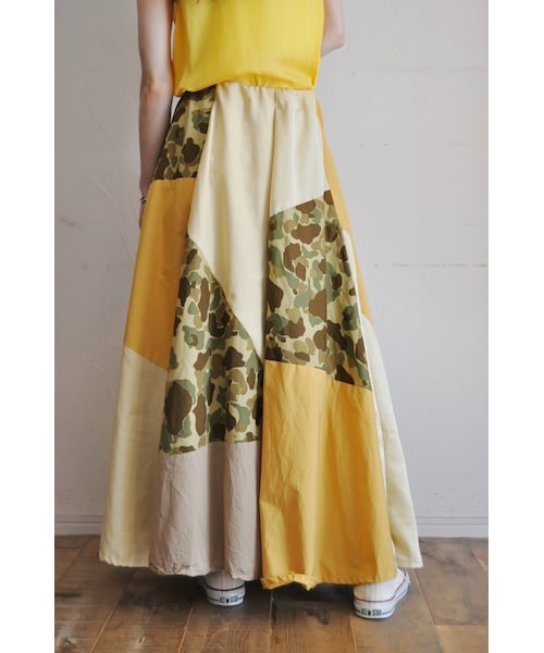 素材の異なる様々な生地を贅沢に使用し、パッチワークで仕上げたロングスカート。 独特な雰囲気と存在感がある唯一無二の一点物です。 ウエストはゴム仕様になっていて、フリーサイズで着用可能。 裏地付きで透けません。