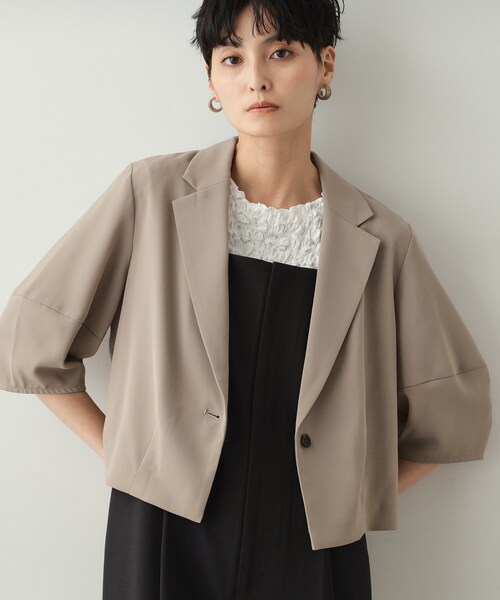 トレンド感たっぷりの、ショート丈5分袖テーラードジャケット 【デザイン】 ・ショート丈が新鮮なテーラードジャケット ・ランタンスリーブデザインの5分袖丈で、夏の羽織に決まるデザイン。 ・一重の裏なしジャケットなので、軽い羽織ものとして夏に向けておすすめです。 ・ショート丈なので、ウエスト位置を高く見せ、どんなボトムスにも合わせ易く、ワンピースにもバランス良く着こなしが可能です。 ※ポケットなし 【素材】 ・やや落ち感のあるポリエステル素材を使用 ・マシンウオッシャブルでご自宅でのお洗濯も可能です。 ※裏地なし ※照明の関係により、実際よりも色味が違って見える場合があります。また、パソコン・スマートフォンなどの環境により、若干製品と画像のカラーが異なる場合もございます。 モデル情報:身長165cm B72 W57 H84 着用サイズ:38(M) 店舗へのお問い合わせ商品番号:637-49022 ●製品寸法: 38(M):着丈49cm B102cm 袖丈35cm 肩幅39cm 40(L):着丈51cm B104cm 袖丈35cm 肩幅39cm 42(LL):着丈53cm B106cm 袖丈36cm 肩幅39cm 備考:重量:38(M)約190g