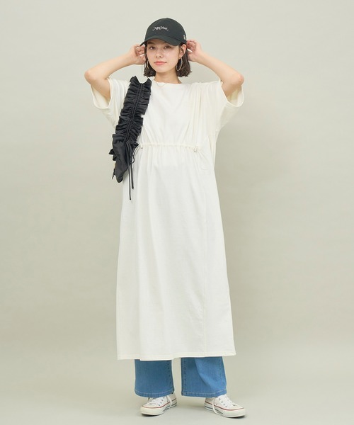 もたつきを解消して取り入れやすくしたTシャツワンピース。【素材感】 ・透けにくい素材にこだわったアイテム。 【デザイン・シルエット】 ・アウトドアテイストのシンプルな半袖Tワンピース。 ・身頃は前後の切り替えをポイントとし、フロントのハイウエスト位置には調整可能なドローコードを配置。 ・ドローコードの活用でシルエットのアレンジが可能。 ・長めの着丈で安心感があり、深めのバックスリットにより歩きやすさも万全。 【カラー】 ・ブラック、オフホワイト、ベージュのベーシックカラー3色展開。 <ロゴ意味> chaque pas compte:一歩一歩が大切 【スタイリングポイント】 ・アドベンチャーハットやトレッキングシューズに合わせてキャンプやフェスに大活躍。 ・インナーにロングスリーブTシャツを重ねると長いシーズン着られる。 ----------------------------- 裏地:なし 透け感:なし 伸縮性:ややあり 生地感・厚さ:普通 ポケット:なし その他仕様:ウエストドロスト調節可能 季節:夏・秋 ----------------------------- ※撮影時の光、お使いのモニター環境によって色の見え方が違う場合がございます。 ※モデル身長:166cm 着用サイズ:38