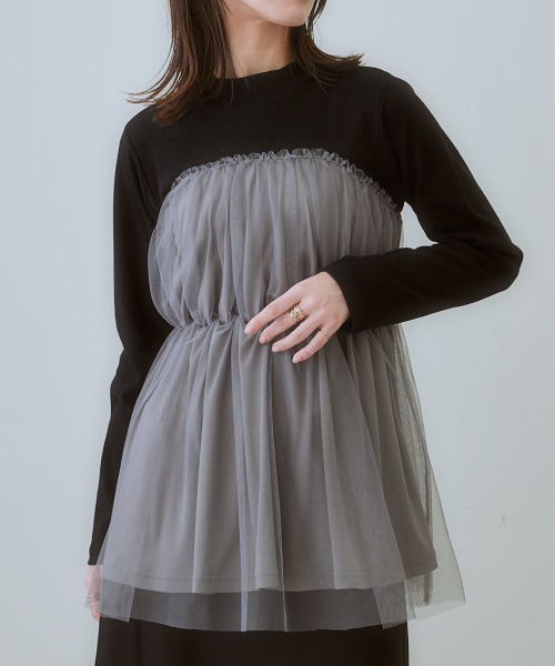 チュールとニットの異素材コンビで、1枚でレイヤードスタイルが完成するプルオーバー。■デザインチュールとニットの異素材コンビで、1枚でレイヤードスタイルが完成するプルオーバー。体のラインを拾わない程よいゆとり感と、ヒップが隠れる丈感で体型カバーも◎。着やすいのにコーデの主役になれて、きれい見えも叶う優秀アイテムです。■素材チュール部分は、肌触りの良い柔らかな素材を使用しています。ニット部分は、伸縮性があり、着心地の良い素材を使用しています。■おすすめのスタイリングデニムやチノパンを合わせたカジュアルなスタイリングはもちろん、きれいめなスラックスを合わせた通勤スタイルにもおすすめです。<仕様>[上身頃]ポリエステル62%・綿33%・ポリウレタン5%(カットソー テレコ) [下身頃]表側:ポリエステル100%(チュール) 裏側:ポリエステル100%(カットソー スムース) アクセサリー等の引っかかりにご注意ください<洗濯方法>手洗い■キーワード30代、40代、50代、60代、アラサー、アラフォー、たいけいかばー、かわいい、カワイイ、お洒落、日常着、普段着、日常使い、毎日、秋、きれカジ、大人女子、トレンド、シンプル、オフィスカジュアル、お出かけ、、レディース、ファッション、トップス、Tシャツ、カットソー