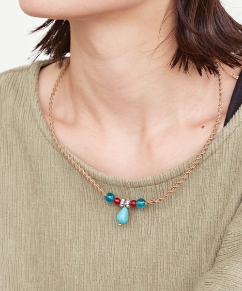 しずく型のターコイズブルーのストーンが印象的なネックレス。カジュアルコーデやエスニックスタイルのアクセントに◎ターコイズブルーは、空色を想わせる色彩のようにとても明るいエネルギーを持ち、困難を乗り越え、願望を達成するための助けになるとされています。行動する勇気を与えてくれる旅のお守りとしてもおすすめです。・結び目を軸にコード(紐)を左右に引くと長さ調節可能です。※こちらの商品は1点1点職人による手作りとなります。また天然素材を使用しております為、石の形や色合いなど若干個体差がございます。(画像は一例です。)あらかじめご了承ください。Amina Collection Co.,LTD.