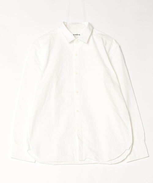 quadroの代名詞とも言える白シャツです。 コットン100%の綿糸を高密度で織りあげることで、ハリ感とシャリ感があります。 着れば着るほど生地が柔らかくなり、ナチュラルなシワが味になる1枚です。 小さめの襟やシンプルな胸ポケが程よいアクセントで、インナーやボトムスを選びません。 サラッと一枚で着ても、羽織としても重宝する長年愛用したいアイテムです。 「素材」 コットン100%の綿糸を高密度に平織した生地です。 程よい薄さで肌触りもサラッとしていますが、丈夫さも兼ね備えています。 最後に洗いをかけていますので、程良いシワ感も楽しめます。