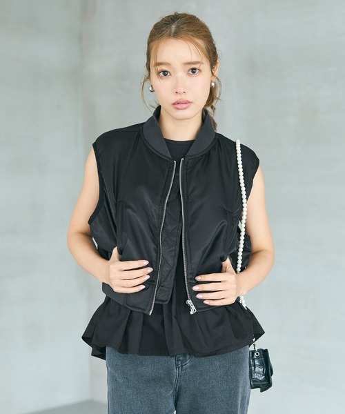 MA-1デザインを落とし込んだノースリーブジャケット ■デザイン・シルエット トレンド感のあるコンパクトなクロップド丈で、スタイリングのバランスがとりやすく、 さっと羽織るだけでいつものコーデをぐっと格上げします。 両サイドにポケットが付いているので、実用性のあるデザインなのも魅力◎ 厚手のニットやスウェットなどもレイヤードしやすいデザインです。 ■生地 ・柔らかいナイロン生地で肌触りも◎ ・耐久性に優れておりデイリーケアがしやすい ■コーディネート コンパクトめのサイズ感なので、ボリュームのあるボトムを合わせると バランスの良いスタイリングが作れます。 インナー次第でロングシーズン着まわせるところもポイント。 季節の変わり目にはライトアウターとしても重宝します。 伸縮性:襟元、裾あり 透け感:なし 裏地:あり ポケット:あり 生地感:柔らかいナイロン生地 注意点:摩擦等により、毛羽立ちや毛玉が生じやすいため、連続着用はお避け下さい。 お洗濯方法によっては縮みや色あせの可能性あり。乾燥機等のご使用はお控え下さい。 ▼生地や素材の性質により2cm前後サイズ誤差が出る場合がございます。 ▼モデル着用写真は撮影環境により、多少実際のカラーと異なる場合がございます。 ▼色落ちの恐れがありますので、他のものと分けて洗って下さい。 ▼当商品は機械による生産の過程上、『生地を織る際の糸の継ぎ目』や多少の『ほつれ』、繊維の『混紡』、形やサイズに多少の『誤差』が生じる場合がございます。