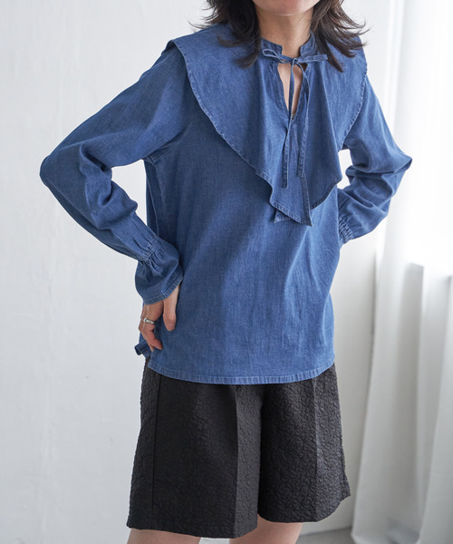 ひらひらと波打つ、華やかなラッフルカラーのデニムシャツ。デニムのカジュアルさと、ラッフルのエレガントな雰囲気がマッチした一枚です。【素材】薄い色味から、濃い色味まで揃えたデニム素材。【デザイン】襟元はラッフル、袖口はゴム入りできゅっと絞ったキャンディスリーブです。【おすすめコーディネート】一枚で華やかコーデが完成!イージーパンツでラフに着崩したり、タイトスカートで品よくまとめたり、デニムならではの着回し力が魅力です。★Instagramにて近日発売予定のアイテムやルックをご紹介しております。@vence_sharestyle★《お気に入り登録》でお得な情報がいっぱい★・「商品のお気に入り登録」で再入荷通知や、ラスト1点の通知、セール通知も受け取ることができます。・「ブランドのお気に入り登録」で新商品や再入荷など、お得な情報を受け取ることができます!※商品の色味は、撮影場所や光のあたり具合などにより色味が違って見える場合がございます。また、お客様のお使いのモニター環境などにより色味が違って見える場合がございます。予めご了承の上ご注文下さい。※他のキャンペーンにより、期間中に価格が変動する場合があります。※セールは予告なく終了させていただく場合もあります。[クリーニング]手洗い可、ウェットクリーニング(W)