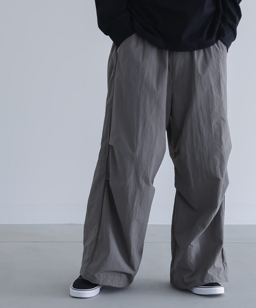 ワイドトラックパンツ 立体的なシルエットが特徴的なトラックパンツ ♦DESIGN&FABRIC 軽い着心地のナイロン生地を使用したトラックパンツ。 膝部分にタックが入った立体的なシルエットがポイントになります。 バックにも切り替えデザインが施され、どこから見てもひとひねりのあるデザインに。 裾を絞ってシルエットのアレンジも楽しめます。 シャカシャカとした質感で軽く、カジュアルな印象の素材。乾きやすくお手入れのしやすいナイロン生地です。 ♦SIZE 【Mサイズ】 着丈(総丈):101cm ウエスト(上がり):78cm ウエスト(最大):101cm ヒップ:116cm わたり幅:41cm 股上(前):38.5cm 股上(後):48cm 股下:65cm 膝周り:70cm 裾周り:70cm 重量:320g 【Lサイズ】 着丈(総丈):103cm ウエスト(上がり):84cm ウエスト(最大):107cm ヒップ:120cm わたり幅:42.5cm 股上(前):40cm 股上(後):51cm 股下:66cm 膝周り:73cm 裾周り:73cm 重量:340g