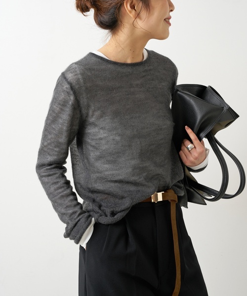 バランスの取れた上品な透け感が魅力のシアーニット。 生後5ヶ月頃のアンゴラ山羊からしか取れない、大変貴重なスーパーキッドモヘヤを使用。 非常に柔らかくヘアリーな風合いと優れた保温性で寒い時期にぴったりのアイテムです。 肌触りもよい素材で上品さのあるラフな印象を演出し、こなれて見せてくれます。 一枚で着るのはもちろんカットソー感覚でインにもしやすいサイズ感も魅力です。 ※アテンション【色落ち】はネイビーのみに該当します。 着用中の摩擦や汗、水などで濡れたことによる他のものへの色移りにご注意ください。 ※取り扱いについては、商品についている品質表示でご確認ください。 ※こちらの商品は、Spick & Spanでの取り扱いになります。 直接店舗へお問い合わせの際は Spick & Span店舗へお願い致します。 ※照明の関係により、実際よりも色味が違って見える場合があります。 またパソコン・スマートフォンなどの環境により、若干製品と画像のカラーが異なる場合もございます。 ※商品の色味は、商品アップ画像をご参照ください。 本体:ドライクリーニング